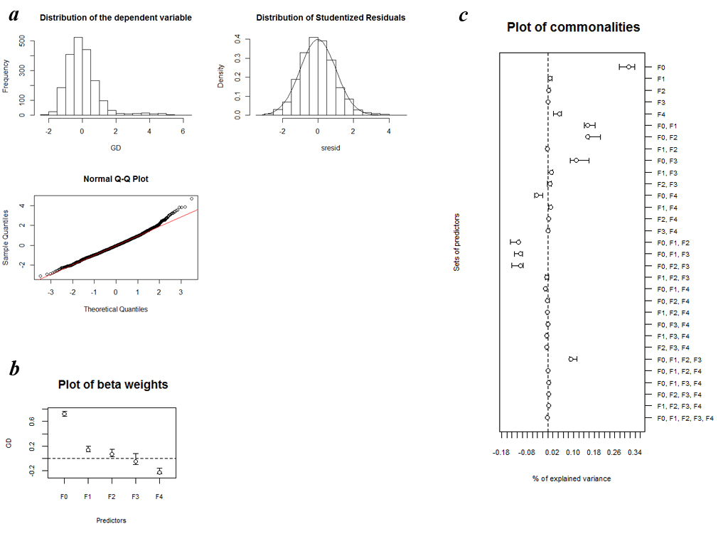 a) Distribution of the dependent variable, histogram and normal Q–Q plot of studentized residuals resulting from MRDM on quantitative datas.