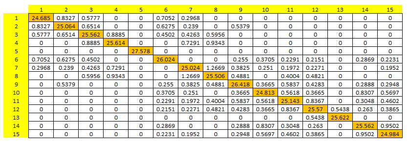 An output matrix providing the mean number of individual exchanges among 15 populations (N=30) per generation. Diagonal elements (in orange) correspond to the mean internal recruitment per population and per generation.