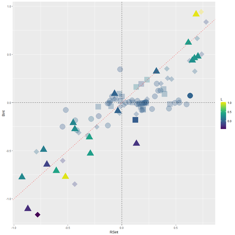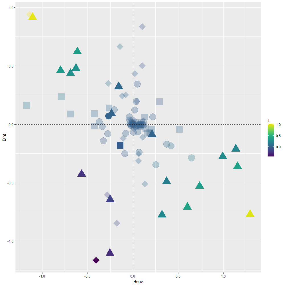 Scatterplot showing the results of 99 linear nested mixed effect models run to assess the putative driver of each TER in Macdonald et al. Symbols indicate whether a TER was found to be null (circles), driven by plasticity (squares) or driven by local adaptation (triangles) while taking uncertainty in the model estimates into account. Situations where Bint is non-null but Benv is null (diamonds) indicate that TER does not exist at intermediate levels of connectivity but does exist at low/high levels of connectivity, which may indicate that (mal)adaptation may covary non-linearly with connectivity . A solution to interpret ongoing processes in such situations is to plot predicted trait values obtained from the fitted model against explanatory variables (see InteractionPlot.R script). Colors indicate values for the L index of local adaptation. Faded colors indicate that the L index was not different from 0 according to 95% CI.