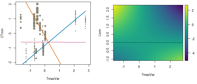 Panels a and b represent the CTmin ~ Tmaxvar TER as computed from a linear nested mixed effect models using Macdonald et al.’s dataset. Panel a shows a “fan representation” of the interaction (following Aiken et al. 1991), with predicted values computed at three different and contrasted levels of connectivity, that is, for minimal (“Low”, blue line), null (“Intermediate”, pink line) and maximal (“High”, orange line) values of connectivity. Grey points represent the observed positions of the trait values along the environmental gradient, the size of each point being proportional to the corresponding level of connectivity. Panel b shows a continuous representation of the interaction, with predicted values computed across all possible values of connectivity (the black dashed line indicating intermediate level of conectivity)and plotted as a colored surface in the Environment-Connectivity space. The TER at intermediate level of connectivity was null (according to 95% CI), but investigating TER at low and high levels of connectivity indicated that it was eroded by gene flow.