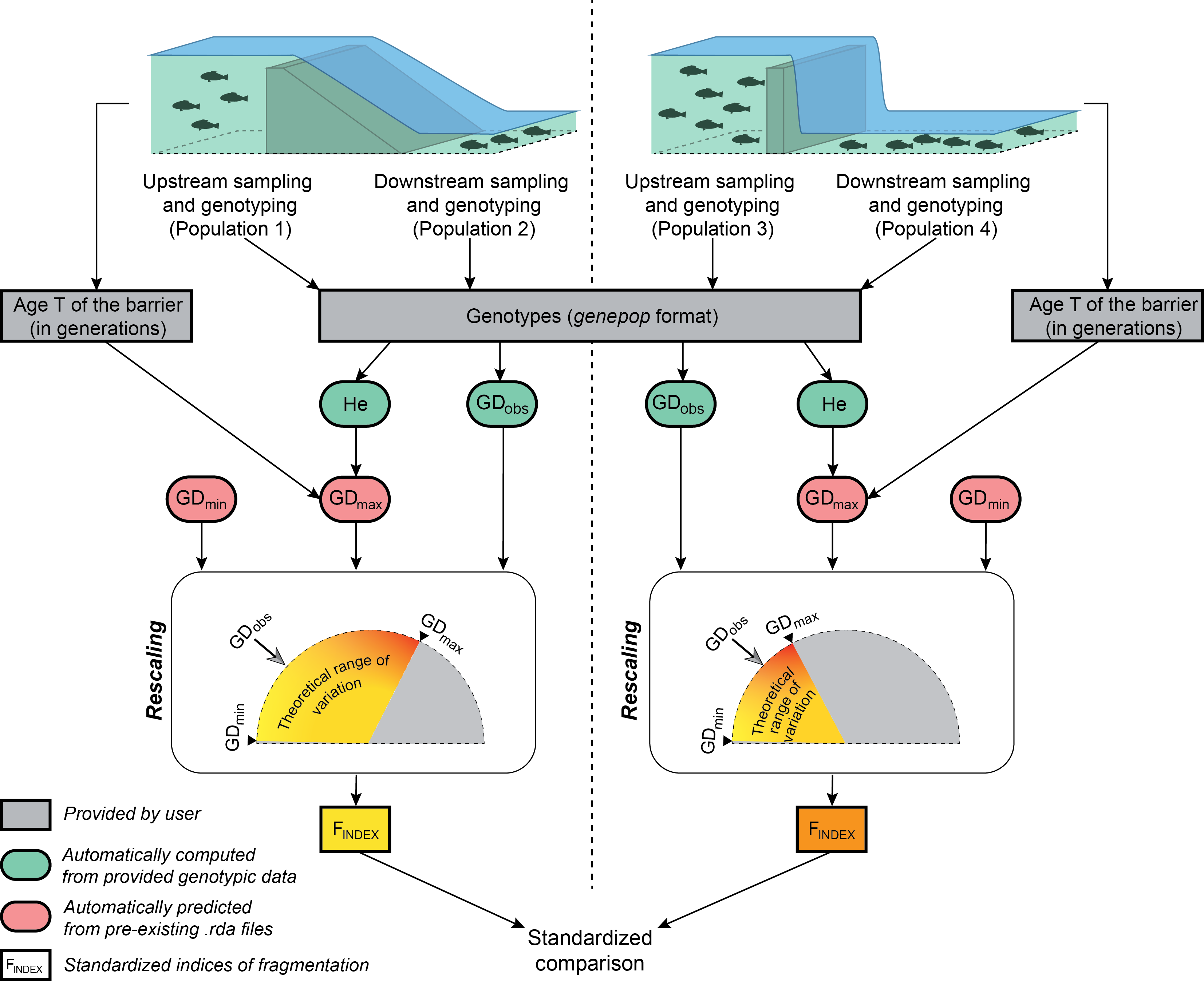 Flowchart illustrating the major steps in calculating the genetic index of frgmentation for two independent obstacles. After the sampling of populations located at the immediate upstream and downstream vicinity of each obstacle, users only have to provide a file of genotypes in the genepop format and a file of parameters indicating, for each obstacle, the names of the sampled populations and the number T of generations elapsed since the creation of the obstacle. Observed measures of genetic differentiation GDobs and mean expected heterozygosity He are automatically computed from provided genotypic data. GDmin and GDmax values, both delimiting the theoretical range of variation of GDobs, are automatically predicted from pre-existing .rda file, GDmax values depending on both He and T. The computation of the Findex basically amounts to rescaling GDobs within its theoretical range, thus allowing standardized comparisons of the permeability of various obstacles, whatever their age, the considered species or the effective size of sampled populations.