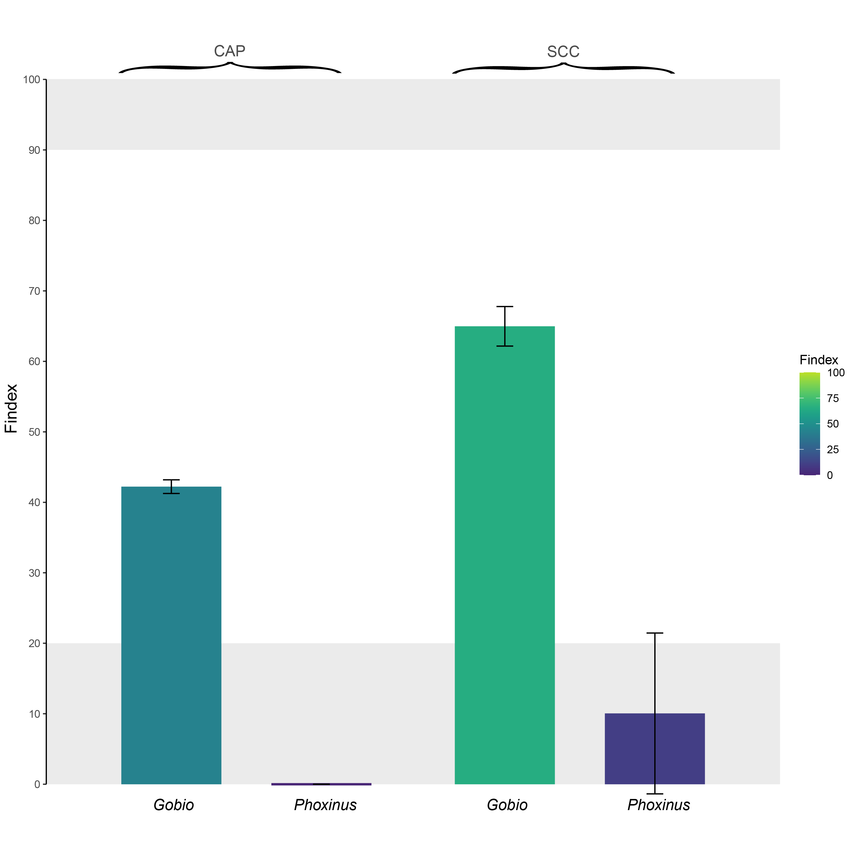 For each monitored species (Gobio: Gobio occitaniae; Phoxinus: Phoxinus phoxinus), Findex values for two weirs (CAP and SCC) selected from Prunier et al. 2018. These two weirs act as barriers to gene flow in Gobio occitaniae (Findex > 20 %), but not in Phoxinus phoxinus (Findex lower than 20 %). In the case of Gobio occitaniae, the Findex also allows ranking the obstacles from the most problematic (SCC; Cindex ~ 65 %) to the least problematic (CAP; Cindex ~ 42 %) in terms of fragmentation.