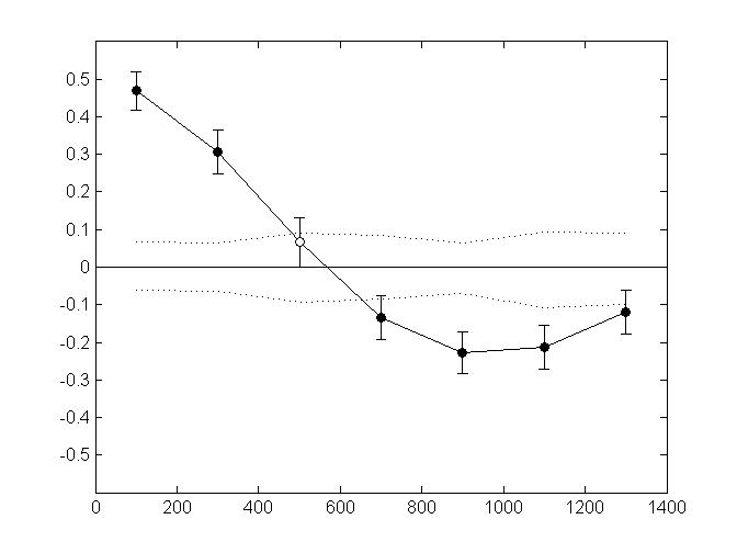 Non-directional Mantel autocorrelograms with restricted permutations and boostrap resampling. Error bars bound the 95% confidence interval about r (y-axis) as determined by bootstrap resampling. Upper and lower confidence limits (dotted line) bound the 95% confidence interval about r under the null hypothesis of no spatial structure. Black circles indicate a significant Mantel correlation value at alpha=5%.